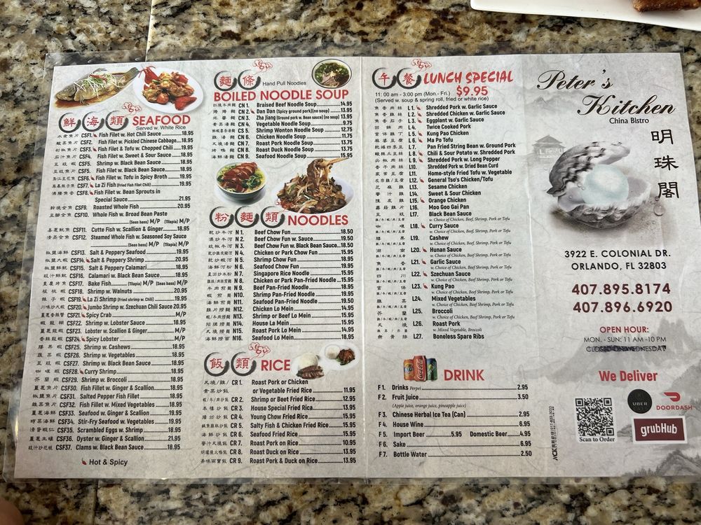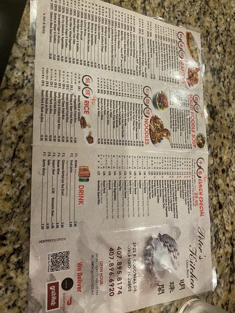 Peter's Kitchen China Bistro on Colonial Drive in Orlando is a seafood gem offering a balance of traditional and modern Chinese flavors. With standout dishes like Crab Rangoons, Wonton Soup, and General Tso Chicken, each bite is a burst of fresh and satisfying flavors. The ambiance is inviting with attentive staff, ensuring a seamless dining experience. Prices are fair, portions are generous, and every dish is made with quality ingredients. Whether you're a dim sum enthusiast or craving a classic Chinese entree, Peter's Kitchen China Bistro is a must-visit spot that won't disappoint.
