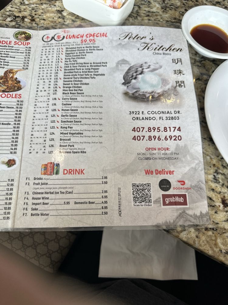 “ If you're in the mood for exceptional Chinese cuisine, Peter's Kitchen China Bistro is a must-visit. Located on colonial drive this bistro offers a menu that balances traditional flavors with modern twists, ensuring every dish is a delightful experience. A few standout dishes that left a lasting impression were the Crab Rangoons, Wonton Soup and the general Tiso Chicken. The Crab Rangoons is a blend of comfort and indulgence, featuring perfectly fried wontons filled with creamy crab and bursting with flavor, the wonton soup has savory broth that elevates the classic dish. It's a perfect starter that sets the stage for what's to come. The general Tiso Chicken at Peter's Kitchen China Bistro is far from the average takeout version. Lightly battered and perfectly crispy, the chicken is enveloped in a tangy, spicy infused glaze that strikes a harmonious balance between sweetness and spice. Each bite bursts with fresh flavor, making it both satisfying and memorable. The ambiance of the bistro complements the food - inviting and warm with subtle nods to its cultural roots. The staff are attentive, ensuring that the dining experience is both enjoyable and seamless. Overall, Peter's Kitchen China Bistro is a spot that impresses with its thoughtful dishes and commitment to quality. Whether you're a fan of classic favorites or looking to try something new, this place won't disappoint. ”